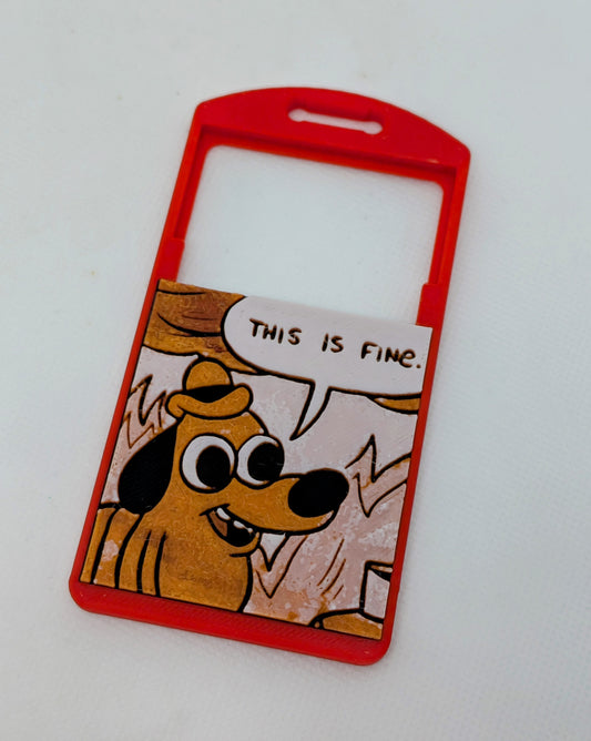 'This is fine' meme over galaxy black or red (your choice) badge holder